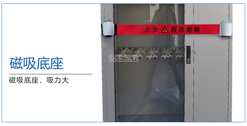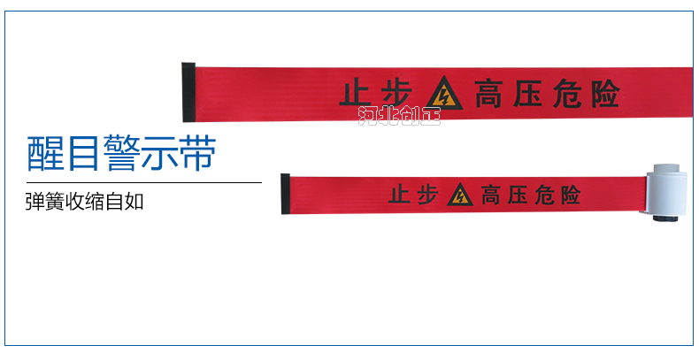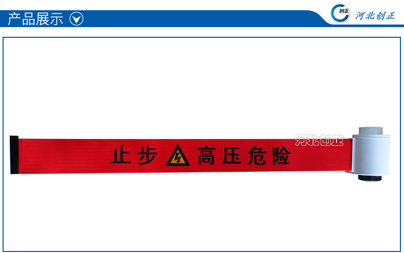 警示帶盒是ABS材料制成;帶是錦綸材質(zhì),上面印有閃電符號,止步,高壓危險等字樣。