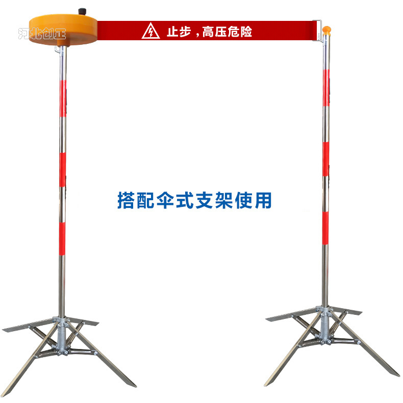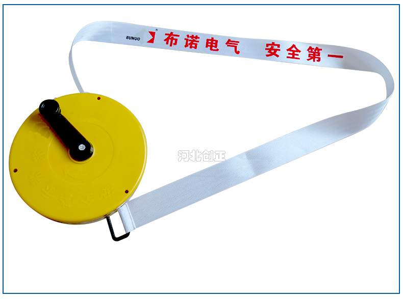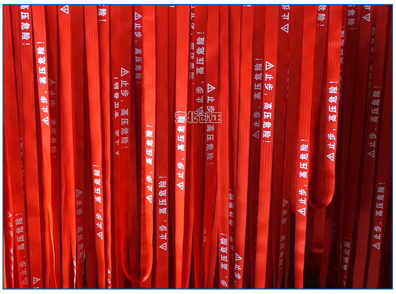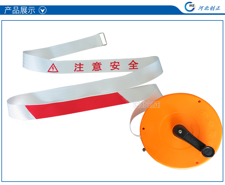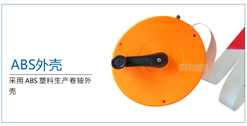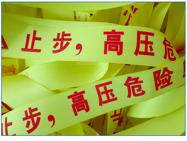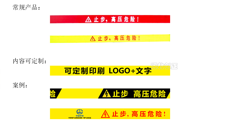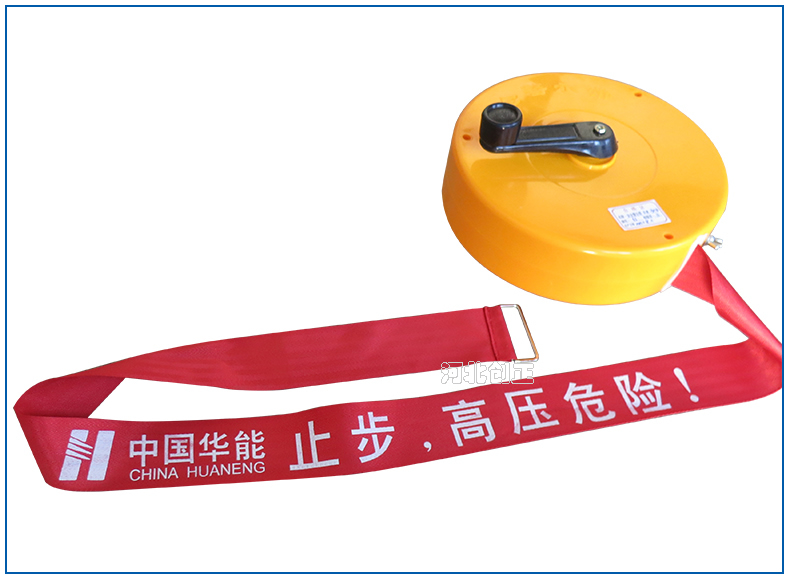 警示帶盒是ABS材料制成;帶是錦綸材質(zhì),上面印有閃電符號,止步,高壓危險(xiǎn)等字樣。