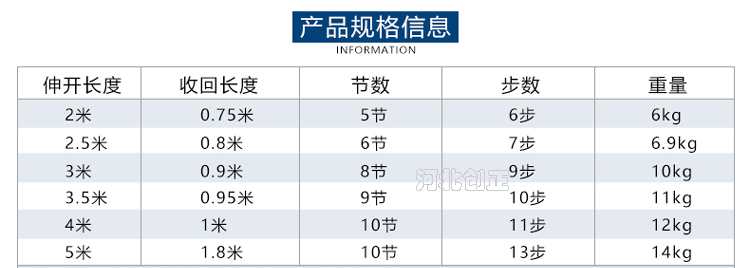 伸態2.0m, 縮態0.75m, 5節, 6步;