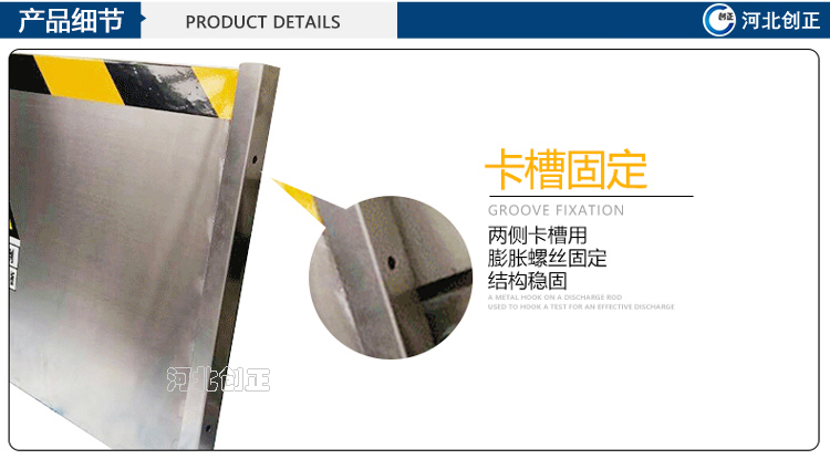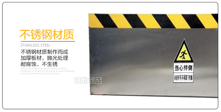 不銹鋼擋鼠板表面經防腐處理。擋板上部貼有黃黑相間的反光條,起到警示作用。